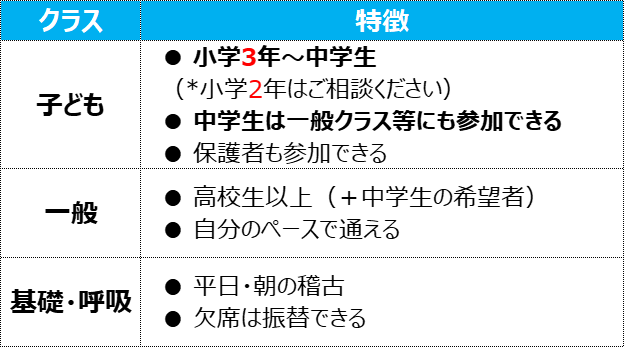 ● 一般クラスの、すべての稽古に参加できます |